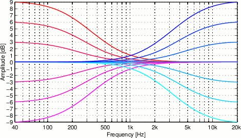 Es handelt sich um reale Messungen an den in Echtzeit auf dem Smartphone laufenden Filteralgorithmen unter Berücksichtigung der tatsächlichen Wortlänge, und nicht um die Ausgabe eines Filter-Design-Programms. Besonders hervorzuheben ist der perfekte “Kuhschwanz”-Verlauf (durch sog. “shelving filter”: nach einem frequenzabhängigen Anstieg wird wieder ein Plateau erreicht), hier mit einem Ankerpunkt bei etwa 1kHz. Die Eckfrequenzen beider Filter lassen sich jeweils dreistufig wählen.
